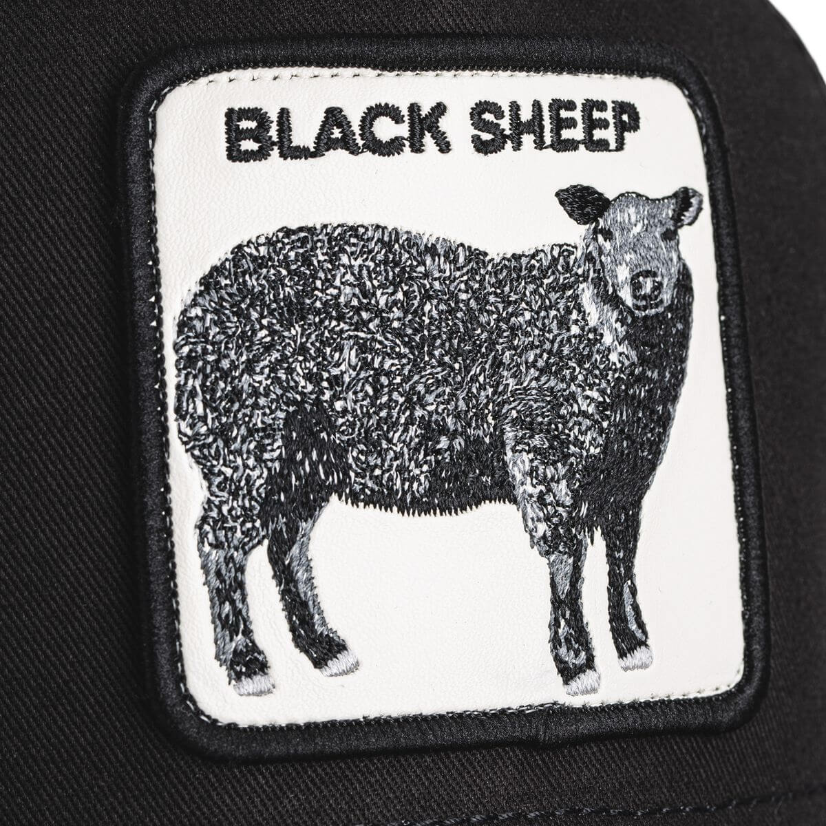 n nHímzett felvarró: Az elülső panelen a fekete bárány ikonikus portréja látható, kontrasztos fehér “Black Sheep” felirattal.
